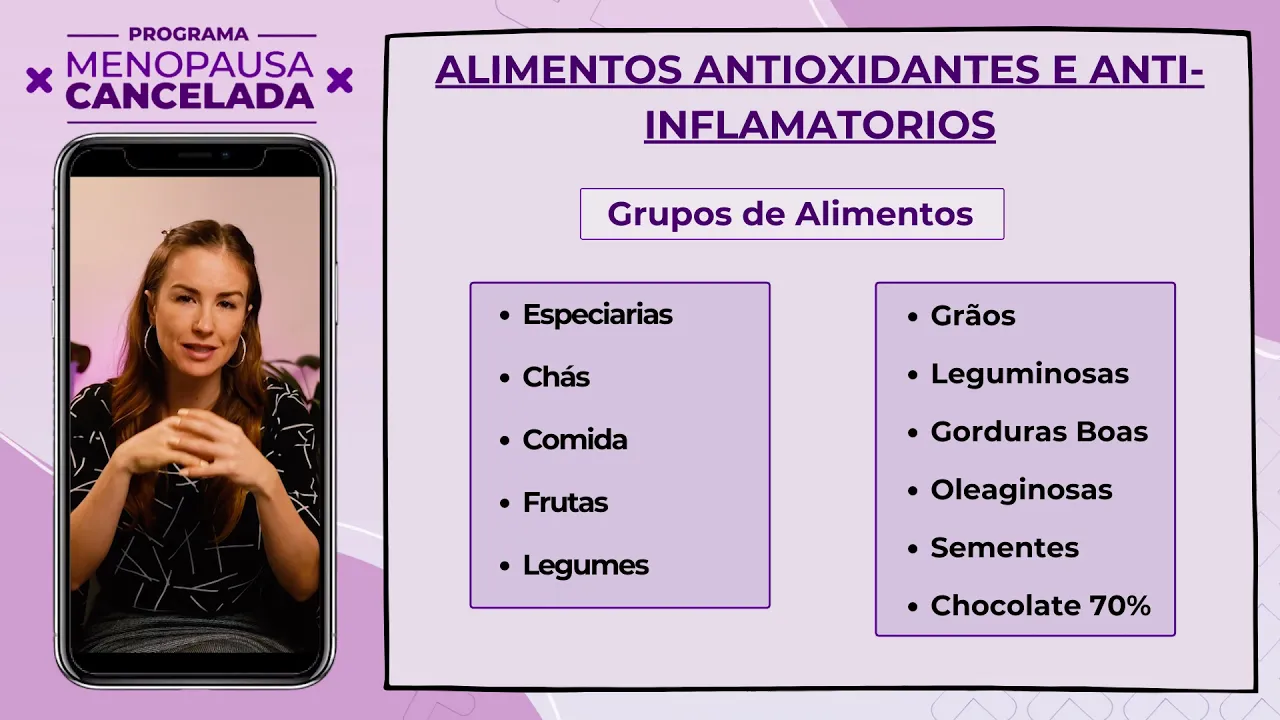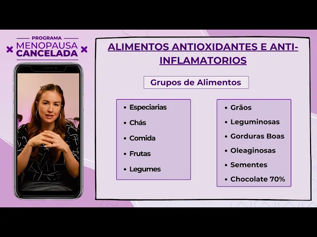 e não é [Música] oi oi minha linda seja muito bem-vinda à nossa segunda aula e nessa aula eu vou te contar Quais são os maiores vilões da mulher está passando pela menopausa são aqueles alimentos que você não pode comer de jeito nenhum ó tem que passar muito longe mas não se preocupa que eu vou te falar vários alimentos que você precisa e deve incluir ali na sua rotina no seu dia a dia e também o perigo do organismo inflamado e o baixo consumo de alimentos anti-inflamatórios e antioxidantes para a sua saúde né O que que