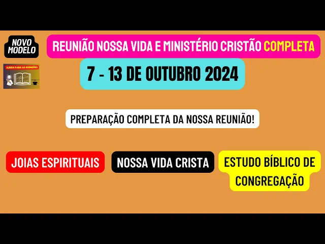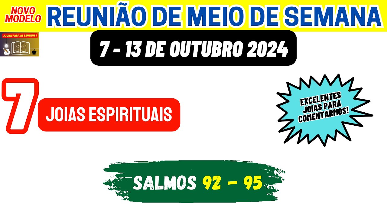 sejam todos muito bem-vindos ao nosso canal ajuda para as reuniões Esperamos que todos vocês queridos irmãos estejam bem e neste vídeo vamos estar disponibilizando a reunião nossa vida e Ministério Cristão completa desta semana 7 a 13 de outubro de maneira objetiva vamos analisar e preparar as partes principais desta reunião que são aquelas por perguntas e respostas onde podemos dar nossos valiosos os comentários iniciando vamos preparar as joias espirituais que podemos encontrar na leitura dos Salmos 92 a 95 Lembrando que esse texto é a base de toda a nossa reunião passando para a sessão nossa vida