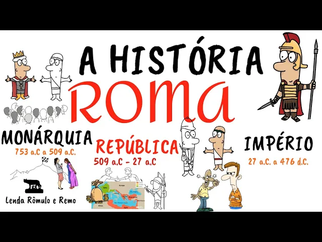 a história de Roma a história do povo romano é dividida em três períodos a monarquia a república e o império a monarquia vai de 753 antes de Cristo a 509 antes de Cristo Já República ela vai de 509 antes de Cristo a 27 antes de Cristo e o império vai de 27 antes de Cristo até 476 depois de Cristo durante a monarquia Roma era governada por Reis segundo a tradição Romana houve Sete Reis nesse período sendo o último deles parquinho o Soberbo a monarquia Romana foi marcada por conflitos internos e expansão territorial em 509 antes