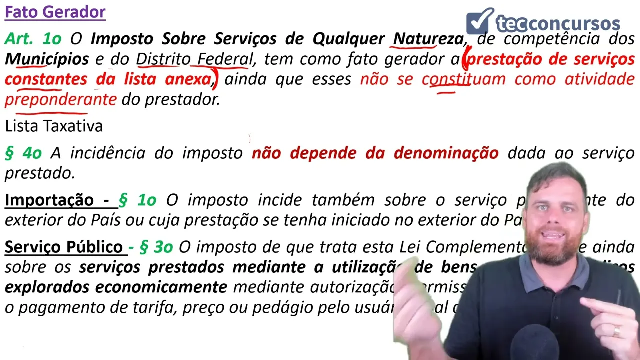 2º do artigo primeiro deixa eu sair da frente aqui para a gente poder ler diz assim parágrafo 1º que trata sobre o ISS na importação a votação o imposto incide também sobre o serviço proveniente do exterior ou cuja prestação tenha se iniciado no exterior do país Então é isso toda vez que eu for importar um serviço Ou seja seus Veio de fora ou se iniciou fora terminou aqui incidirá recairá ISS sobre serviços desde que o serviço seja ele estado né seja lá esteja na lista taxativa ir para que ser verde ao imposto de que trata