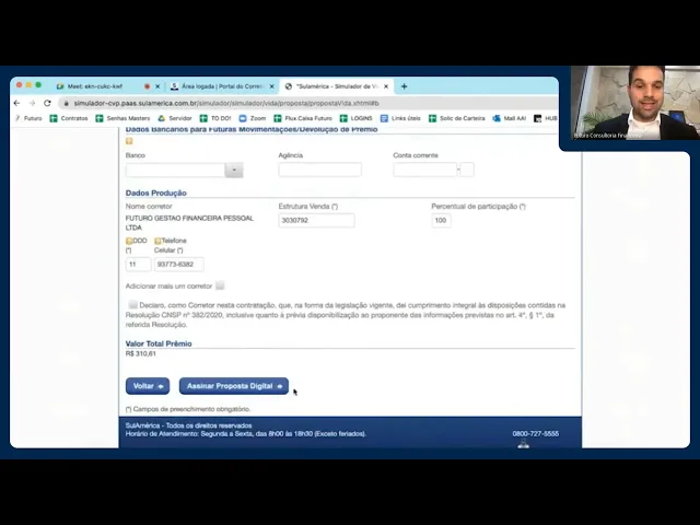 então o que que temos aqui olha aqui vamos lá do início vamos lá do início vamos lá do início Igor Quantos anos você tem mesmo 32 31 31 31 o Igor com 31 anos contratou R 10. 000 de morte 100. 000 de morte acidental 1 milhão de invalidez 10.
