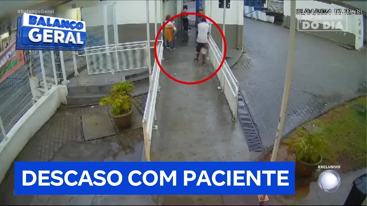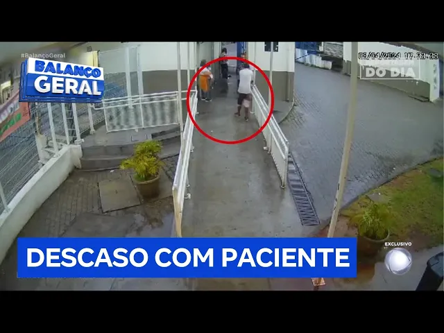 hospital é um lixo Cabe aí é um lixo então é não vou se preocupar com ele não depois de um bom tempo na mesma posição o paciente tenta se levantar um homem corre para ajudá-lo Ed Sandre consegue ficar em pé e dar alguns passos mas logo se desequilibra e cai mais um homem chega e o paciente é erguido novamente e levado para dentro da UPA cerca de uma hora depois às 5:33 o homem é visto saindo sozinho da unidade Ele anda com dificuldade se apoia na barra de proteção mesmo assim consegue chegar até o portão