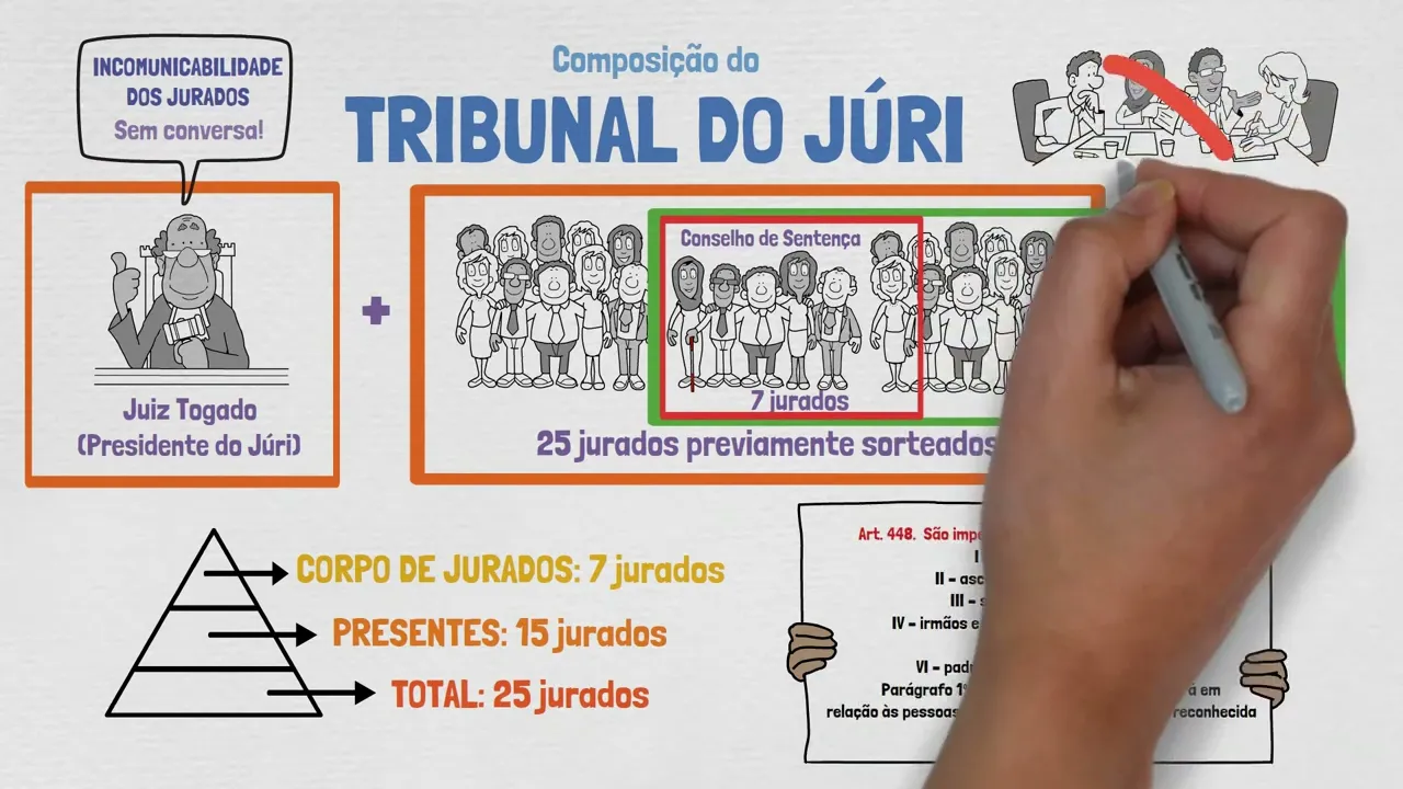 estejam presentes para que o julgamento aconteça no entanto apenas sete serão sorteados para compor o corpo de jurados a quem compete decidir o futuro do acusado antes do sorteio o juiz presidente esclarecerá acerca da incomunicabilidade dos jurados de modo que no júri não pode existir qualquer diálogo entre os jurados a fim de que a opinião de um não influencie na dos demais além dos jurados a presença de algumas pessoas é imprescindível para realização da sessão de julgamento de maneira que a sua ausência poderá inclusive ocasionar o adiamento da sessão vejamos quando estiver ausente o ministério