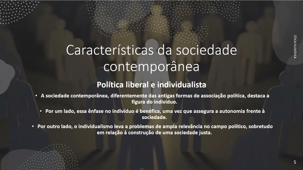 diante de nós a questão da justiça que é um tema moral fundamental hoje também a gente tem que considerar a política pela qual nós somos regidos então outra característica da sociedade contemporânea é seu modelo liberal e individualista de se conceber a política então a sociedade contemporânea de modo distinto das antigas formas de associação política destaca a figura do indivíduo aqui a gente vê que o indivíduo tem primazia sobre o grupo social Nós pensamos as políticas públicas como políticas que asseguram os direitos individuais Porém esse senso de uma comunidade política em torno de um bem comum