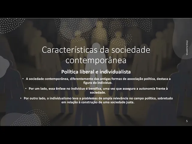 sem que isso demande dele uma Constância coisa que não se observava antes nas comunidades tradicionais no qual a vida individual era profundamente ligada à vida social e coletiva e essa pessoa então tinha uma identidade moral muito bem definida então esses desafios eles são colocados diante de nós o propósito aqui é conhecer melhor a nossa sociedade para entender o valor do estudo da ética nas próximas semanas nós vamos dar recursos para fazer essa análise ser ainda melhor Então essa é a primeira aproximação e eu aguardo vocês nas próximas semanas obrigado [Música]