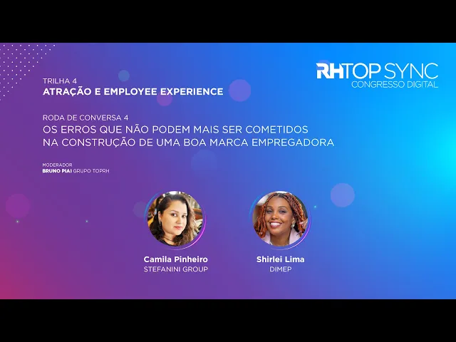 [Música] trilha 4 atração e employe Experience os erros que não podem mais ser cometidos na construção de uma boa marca empregadora convidadas Shirley Lima de me Camila Pinheiro Stefan Grou moderador Bruno pia muito bem-vindos e muito bem-vindas a mais uma atração no nosso RH tops 2024 Estamos aqui na nossa trilha número quatro que fala sobre atração e employe Experience e o tema da vez é um dos assuntos mais importantes atualmente no mercado que é a construção de uma boa marca empregadora Meu nome é Bruno piai eu sou editor no grupo top RH h eu sou