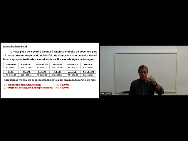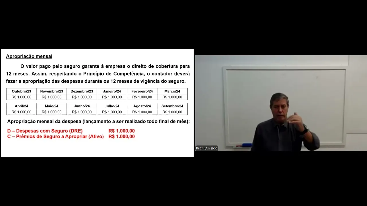 000 Ou seja eu estou contabilizando na conta Premio seguro apropriar um valor uma despesa antecipada vai lá no grupo despesa antecipada que mensalmente mensalmente a empresa vai ir apropriando no caso aí R 1000 apropriação mensal Então olha o valor pago pelo seguro garante a empresa o direito de cobertura de 12 meses então seguindo o princípio de competência monta-se essa planilha em outubro vai apropriar r$ 1 1000 em novembro 1000 dezembro e assim vai até o final da vigência do seguro tá como será feito a apropriação mensal então todo final de mês fa esse lançamento debita despesa com seguro R 1000 e credita-se prêmio seguro apropriar daquela famosa conta que foi contabilizado lá no ativo tá então tira-se daquela conta acredita-se e debita-se despesas com seguro Isso vai ser ser feito mensalmente tá então vai se fazer outubro novembro dezembro janeiro até setembro de 2024 Essa é a forma correta de ser feita tá outro exemplo em janeiro de 2024 a empresa Gama recebeu o carnê de ptu do ano 2024 no valor de R 6. 000 o qual poderá ser pago em quatro parcelas sem acréscimo a empresa optou pelo parcelamento sem acréscimo perfeito a empresa Gama sa é um lucro real com apuração de resultados trimestrais forma correta em janeiro debita IPTU dre 6000 e acredita-se conta a pagar ou IPTU a pagar no passivo 6. 000 já que vai pagar em quatro parcelas isso é incorreto eu não posso contabilizar essa despesa de IPTU direto como uma despesa no mês de janeiro não é janeiro você está pagando o IPTU do ano de 2024 então o que você tem que fazer IPTU apropriar 6.