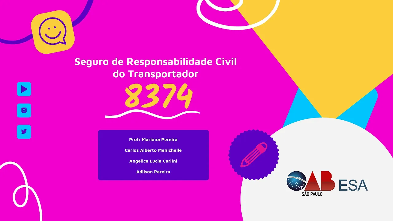 Senhores e senhoras muito boa noite é um prazer estar falando com vocês Espero que me Ouçam bem [Música] Ok estaremos lá no início ao nosso curso de seguro de responsabilidade civil do transportador Rodoviário de carga esse curso como vocês sabem será dado de 8 horas são quatro dias distintos terça quinta e terça e quinta da outra semana eu faria a primeira Apresentação hoje depois nós teremos a professora mariana pereira que essa mulher bonita que aparece aí na imagem e o Professor Carlos melithely que aquele rapaz nem tão bonito que aparece também na tela para vocês