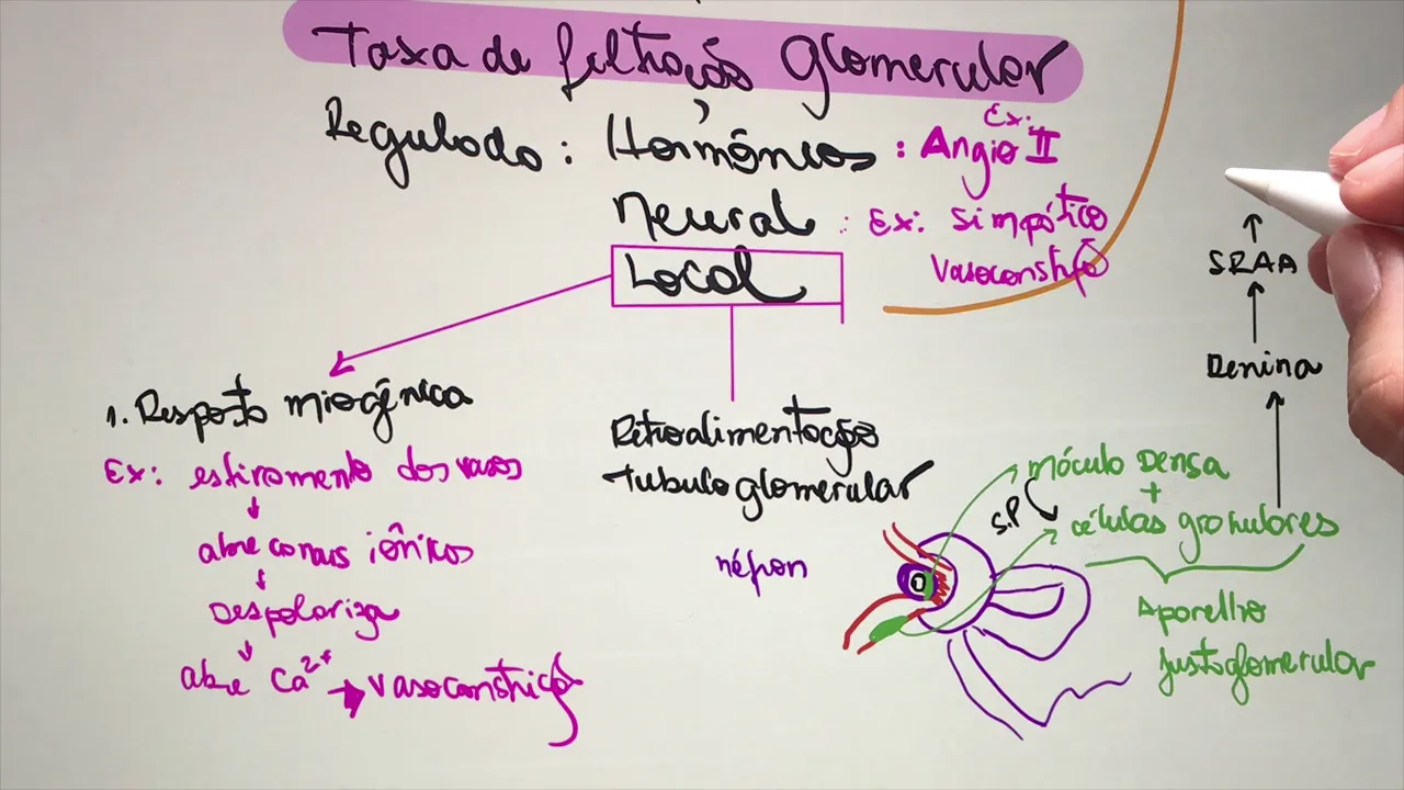 filtrado pelo tempo ou seja a quantidade e filtrado pelos rins e essa taxa de filtração glomerular ela é regulada tanto hormonalmente quanto neural quanto local quando eu falo de um controle hormonal eu falo dos hormônios por exemplo onde eu te ensina a 2 as possa grandinas que podem fazer com que haja uma vasoconstrição das arteríolas que chegam ou que saem e isso vai fazer com que a minha taxa de filtração ela seja alterada ela pode ser neural por exemplo o sistema simpático com a produção de noradrenalina e adrenalina que pode causar vasoconstrição e/ou pode ser