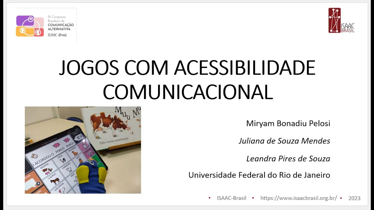 Olá pessoal meu nome é miram pelose Sou professora da Universidade Federal do Rio de Janeiro e escrevi esse trabalho junto com as estudantes Juliana de Souza Mendes e Leandra Pires de Souza vamos falar sobre os jogos com acessibilidade comunicacional vamos falar sobre o brincar adaptado brincar é uma atividade primordial pro desenvolvimento de todas as crianças e as Crianças com dificuldades motoras visuais cognitivas emocionais sociais ou comunicativas podem necessitar de apoio ou de intervenções específicas para favorecer o brincar esse trabalho foi desenvolvido dentro do arcabouo do projeto tô brincando tô brincando brincando na terapia ocupacional que