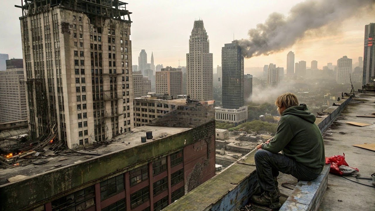 In the morning, she wakes up hung over inside the office with no one there. She rushes back home, but the streets are deserted and no one is walking and no cars are moving. She gets inside her apartment and calls out for people, but no one is there.