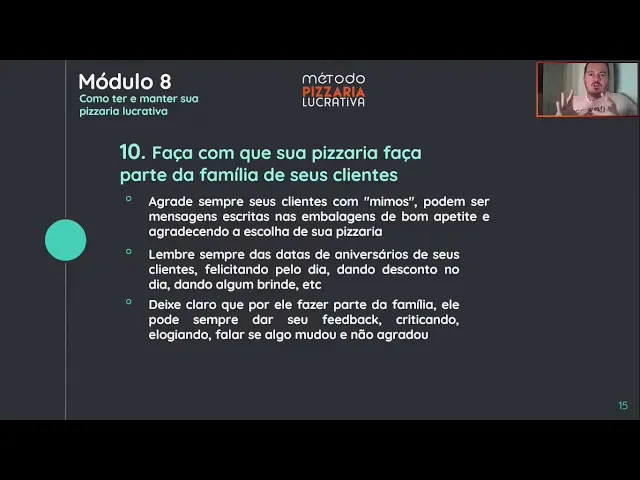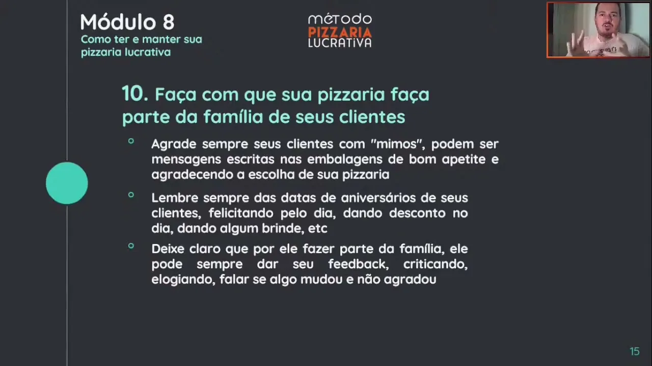 [Música] o próximo eh faça com que sua pizzaria faça parte da famía eh parte da família dos seus clientes hoje o que a moda é é atendimento humanizada você tá mais próximo dos seus clientes o cliente tem que sentir que sua pizzaria faz parte da família dele como aconteceu aqui comigo que passou de pai para filho para neto justamente porque a gente sempre estava presente na mesa deles então o que que você pode como é que você pode conseguir isso eh agrade sempre os seus clientes com os míos pode ser uma mensagem e aí você
