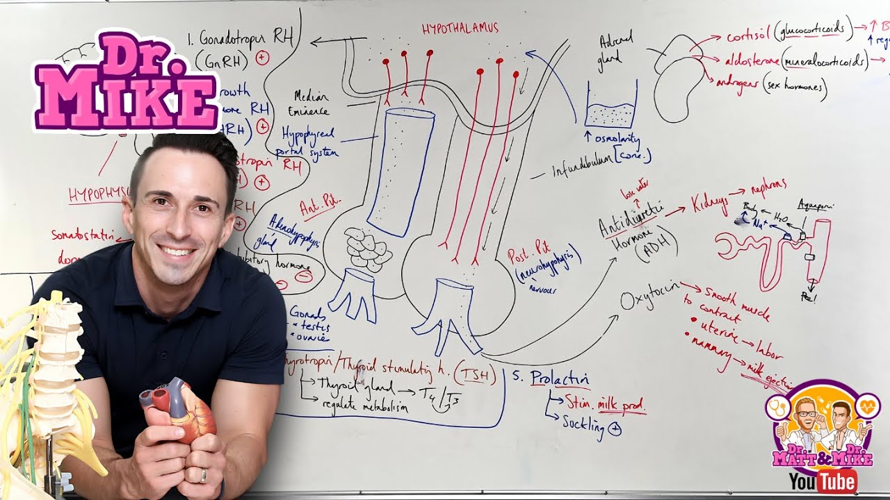 hi everyone dr mike here in this video we're going to take a look at the endocrine system [Music] now the endocrine system is a collection of cells and glands that produce and release hormones these hormones are just chemicals that jump into the bloodstream and have their effect in distant areas of the body now it's a communication network similar to the nervous system that controls physiological activity but it's a little bit different it's different in the sense that the nervous system is very fast it's very direct and usually it's short acting the endocrine system is the