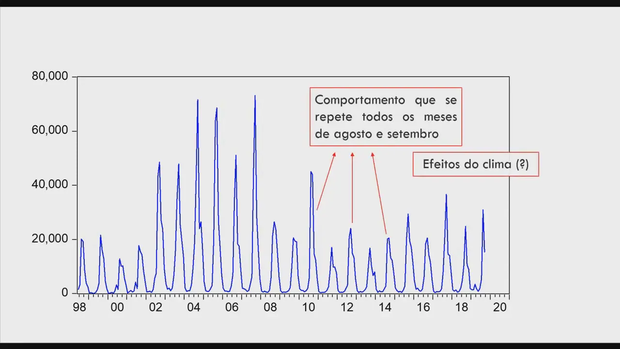 o Olá pessoal tudo bem com vocês nesse vídeo vamos abordar questões relacionadas à sazonalidade de uma série temporal como vimos a tendência é o importante componente de uma série de tempo além da tendência a sazonalidade também um fator que pode explicar uma parcela significativa da variável podemos definir sazonalidade como movimentos temporais regulares que ocorrem em uma variável normalmente em períodos específicos do ano esses movimentos ocorrem devido ao chamado efeito calendário e por exemplo o clima é um fator de suma importância na geração de diversos produtos agrícolas e as condições climáticas dependendo da época do ano