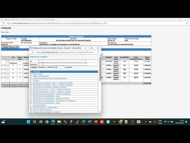 sim quando o nosso caso aqui ele trabalha com o menor preço né deixamos aqui então o menor preço só precisar altera aqui deixar isso aqui com menor preço e marcar as duas opções aqui que é o lote para fazer parte já trouxe para cá para baixo dizendo que pertence eu altero na minha caixa de listagem para todos vou na lupinha novamente localize a minha descrição do meu lote Lote 2 vai selecione deixo com menor preço silencione né aqueles dois itens que pertencem ao lado 2 e por fim silencione na caixa de listagem localizo o nome