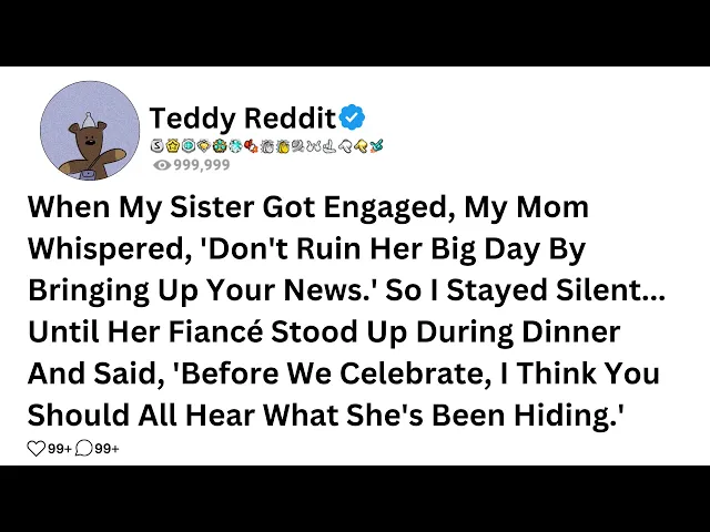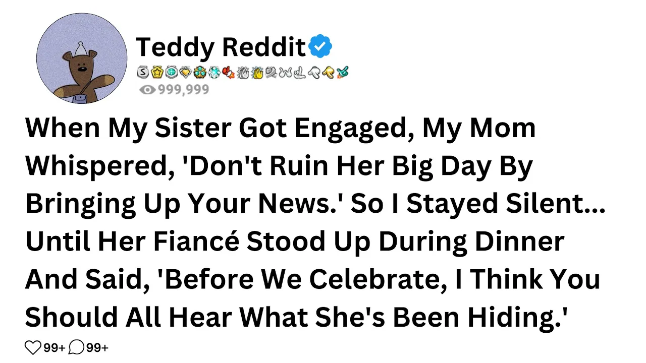 When my sister got engaged, my mom whispered, "Don't ruin her big day by bringing up your news. " So, I stayed silent until her fianceé stood up during dinner and said, "Before we celebrate, I think you should all hear what she's been hiding. " The room fell completely silent.
