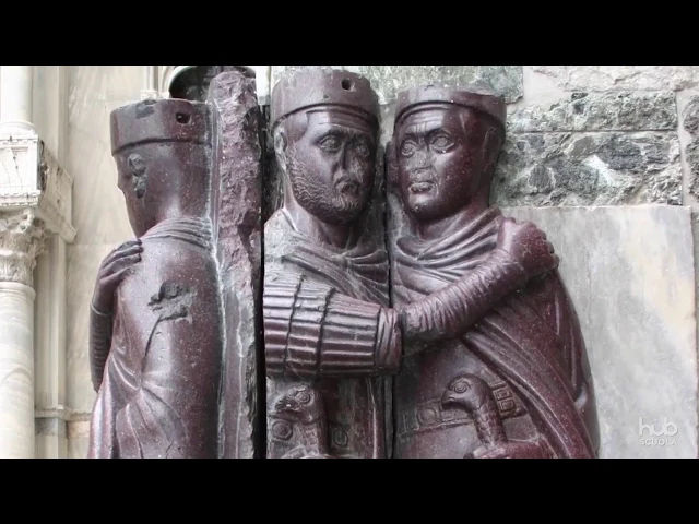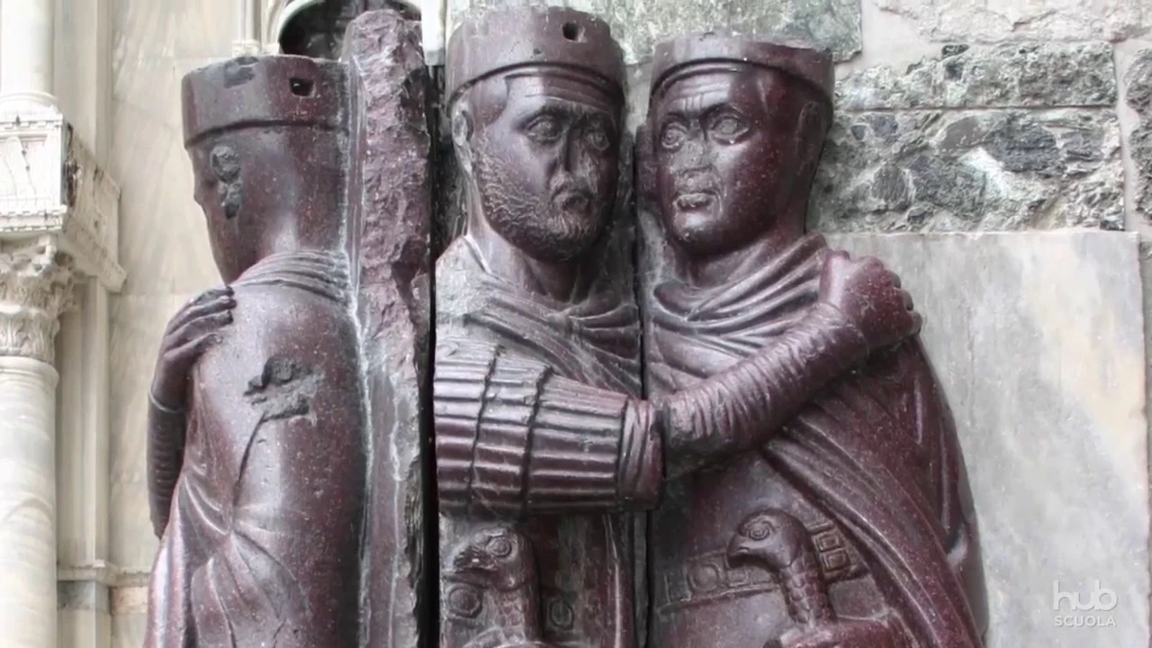 mentre si abbracciano con un gesto di concordia sono il simbolo della pace che la riorganizzazione politica aveva portato all'impero ma sono anche l'indizio che qualcosa nell'arte ufficiale romana sta cambiando che lo stile ellenistico scelto da augusto per rappresentare il potere solo tre secoli prima non era più usato dagli imperatori alla fine del dominio romano le figure assumono forme più geometriche e meno realistiche diventano meno dettagliate e aprono così la strada al nuovo stile medievale