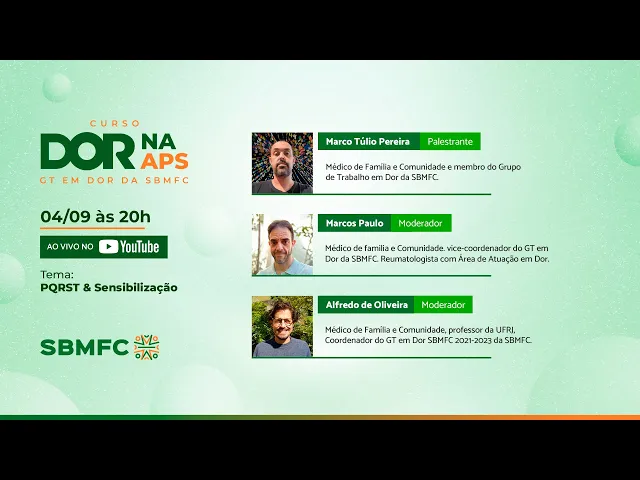 depois sempre a segundas-feiras lá pelo YouTube da sociedade vocês podem ver todas as aulas gravadas então marca é contigo um tá boa noite Marcos boa noite Alfredo Boa noite colegas de todo o Brasil é um prazer enorme tá participando né e Coordenando e conduzindo essa segunda aula desse projeto tão interessante e grandioso que é esse curso de dor para atenção primária organizado pelo G3 de dor da Sociedade Brasileira de medicina de família dá um friozinho na barriga falar ao vivo pelo YouTube Mas vamos tentar né Marcos já me apresentou né mas reforçando um pouco não