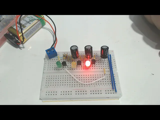 usar um Jumper mais longo ó não tem problema Posso usar esse Jumper aqui ó Pronto agora eu tenho o coletor do terceiro ligado na base do primeiro tá então o circuitinho pronto para funcionar Se tiver tudo certinho adicionar ó lá bem legal né bem legal pisca pisca aí o sequencial de três leds usando três transistores isso aí dá para montar até um semáforo né ó verde amarelo vermelho pula pro Verde pro Amarelo pro vermelho claro que se você aumentar o valor dos capacitores você aumenta at temporização dos leds Tá mas é bem legal bem interessante