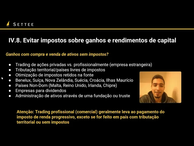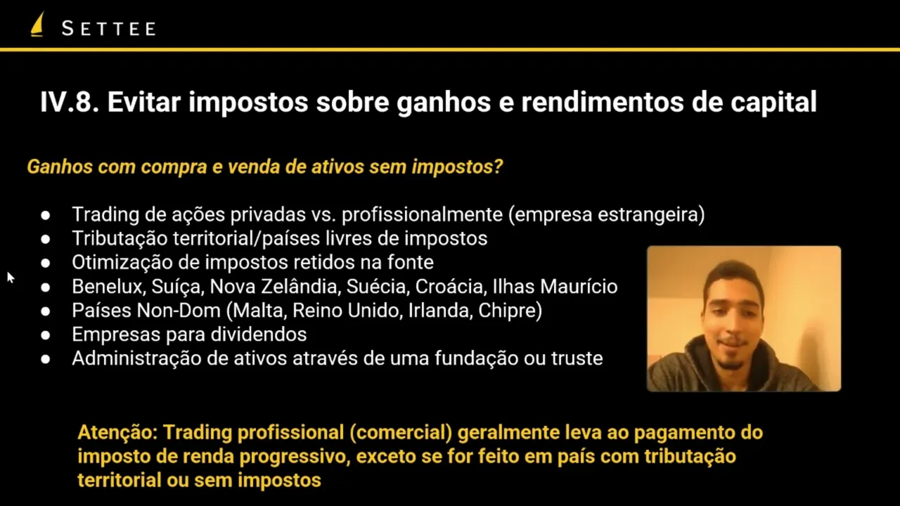 como que a gente pode ter ganhos com compra e venda de ativos sem impostos aqui a gente tem muitas opções na verdade se você tem uma boa renda de dividendos você tem bastante renda de ganho de capitais você vai ficar feliz em saber que existem muitos países que são interessantes para você então vamos lá a gente tem primeiro a questão da do trading da compra da venda de forma privada ou de forma Profissional ou através de uma empresa estrangeira Isso aqui é uma distinção muito importante é que a gente tem que mencionar aqui tem muitos