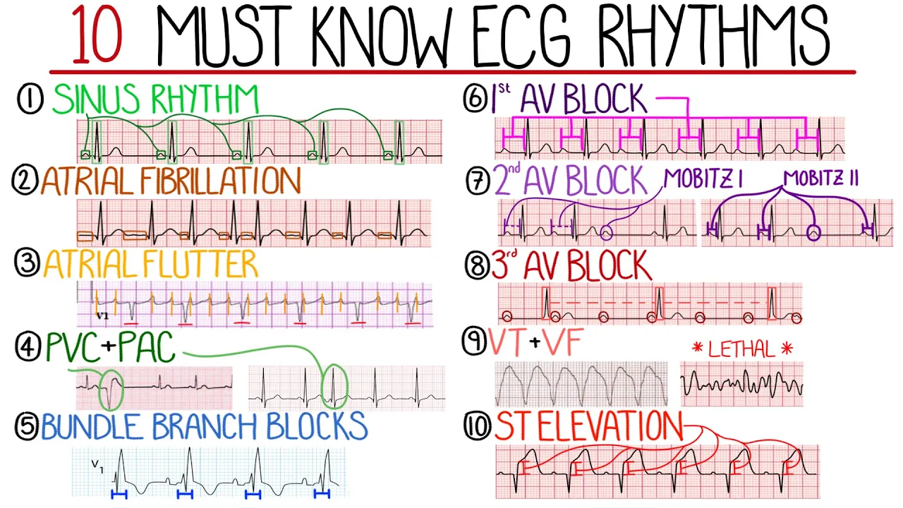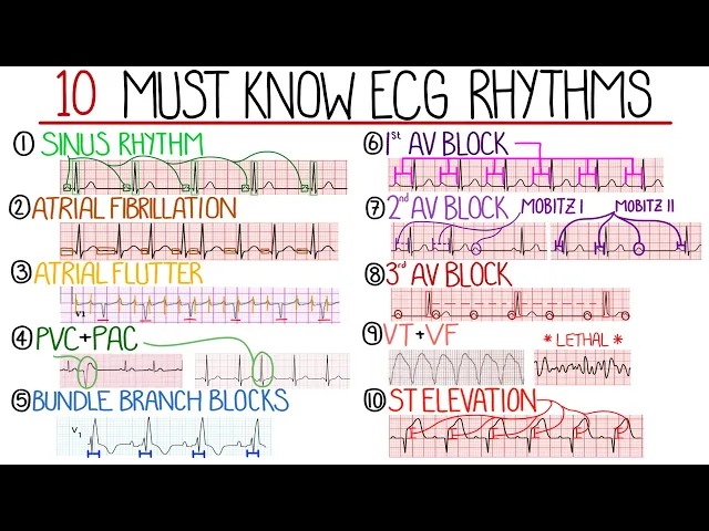 foreign [Music] we will look at some of the most common and must-know ECG findings in medicine we start with sinus rhythm the normal Rhythm of the heart in this instance there are regular p waves followed by a QRS complex that represents normal conduction of the electrical signals from the sinoatrial node in the right atrium through the atrioventricular node and bundle of hiss into the ventricles the PR interval which is the time between the start of the P wave and initiation of the QRS remains constant throughout the QRS complex itself represents ventricular depolarization and is normally