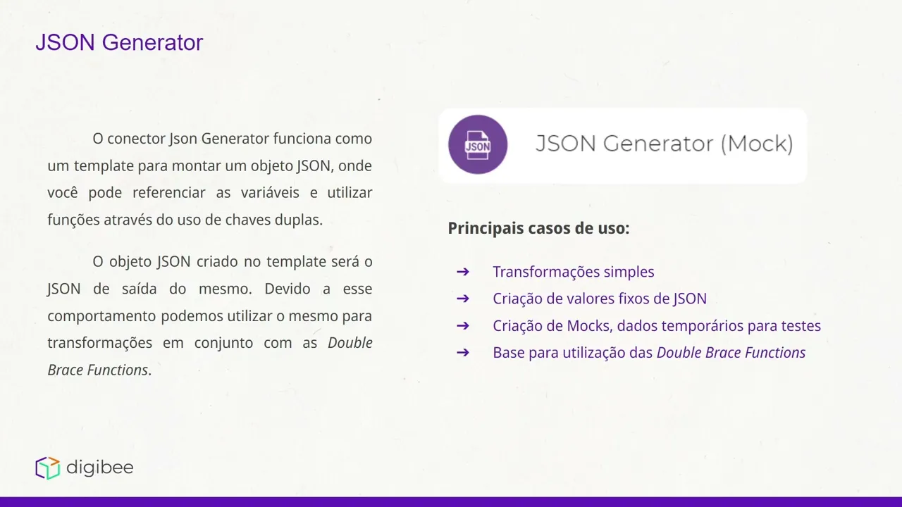 Olá esse é o integration estamos na etapa de onboard fazendo uma revisão no curso no flanaxions nesse vídeo veremos sobre o conector Jason o conector digital ele é um conector de transformação bastante utilizado na plataforma com ele nós conseguimos montar um template de um objeto de Ison e nesse objeto podemos fazer referência de exame de entrada e utilização das funções da plataforma ambos utilizando as chaves duplas ou Double graces a vantagem de usar esse conector é que conseguimos entender que os dias antes de saída é exatamente o divisor criado pelo desenvolvedor logo Por conta desses