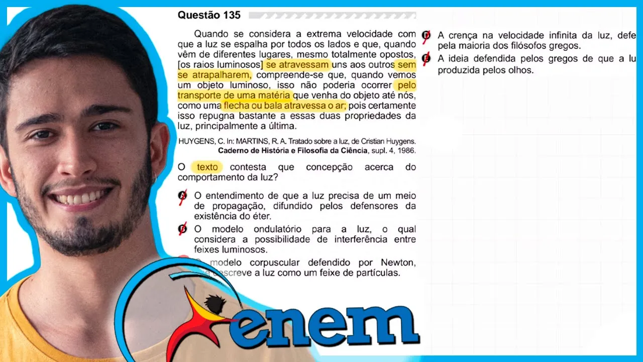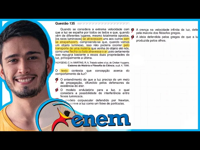 E aí [Música] Oi Bibi no canal fiz aqui Sou professor Thales Eu te entendo tudo sobre física para sua formação como resolver essa questão do Enem 2019 que no caderno azul foi a questão de número 135 e se você não conhece questão então pausa no vídeo e tenta Professor sozinho ou sozinha porque São Paulo sobre o comportamento da luz e a resposta da questão já está praticamente no texto é basicamente uma questão de interpretação ler o texto interpretado anunciado e procurar alternativa que está respondendo enunciado então que tem dois trechos importantes que eu quero grifar