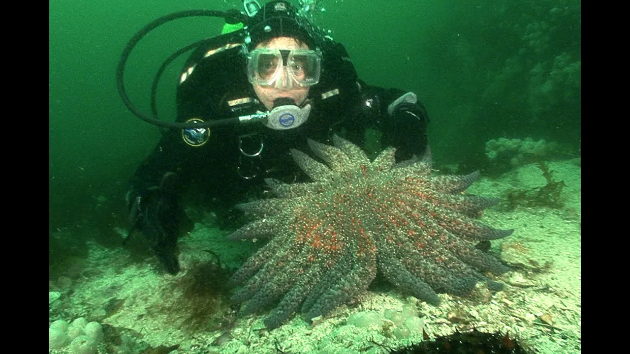 To find it, I've come all the way to British Columbia. I'm looking for the Giant Pacific Sun Star, and you won't believe the size of this thing! In the cold, murky waters of the Canadian north Pacific, I swim through beautiful gardens of sponges, anemones and soft coral, searching for a Giant Sun star.