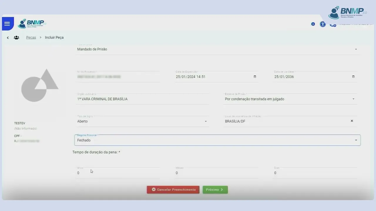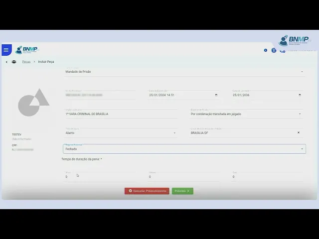 [Música] Como cadastrar a peça mandado de prisão por condenação transitada em julgado para localizar o cadastro da pessoa em pessoas cadastradas Clique na opção ver todas no campo pesquisar digite o nome da pessoa ou outro dado conhecido e Clique na lupa identificada pessoa clique no Men localizado no cant direito da tela e selecione a opção incluir pea em tipo de pea selecione mandado de prisão informe o número do processo e a data de validade do mandado de prisão informe a espécie da prisão indique o local de ocorrência da infração o regime prisional aplicado o tempo