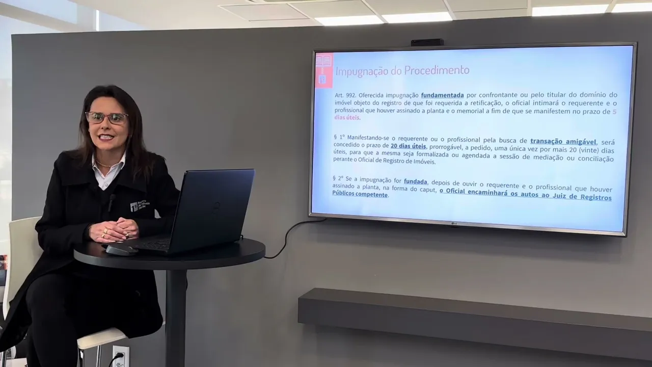 dele nesse caso qual vai ser o procedimento adotado pela serventia nós iremos notificar o proprietário do imóvel e o responsável técnico que assinou por aquela retificação diária por meio de nota de exigência para que em CCO dias eles tentem uma transação amigável entre as partes ou que eles apresentem requerimento para que seja encaminhada essa impugnação ao Juiz da vara dos registros públicos que vai analisar se realmente essa retificação ela pode ser realizada ou se não se tem que ser ouvido se tem que haver uma transação entre os dois entre os dois enfim Então nesse prazo