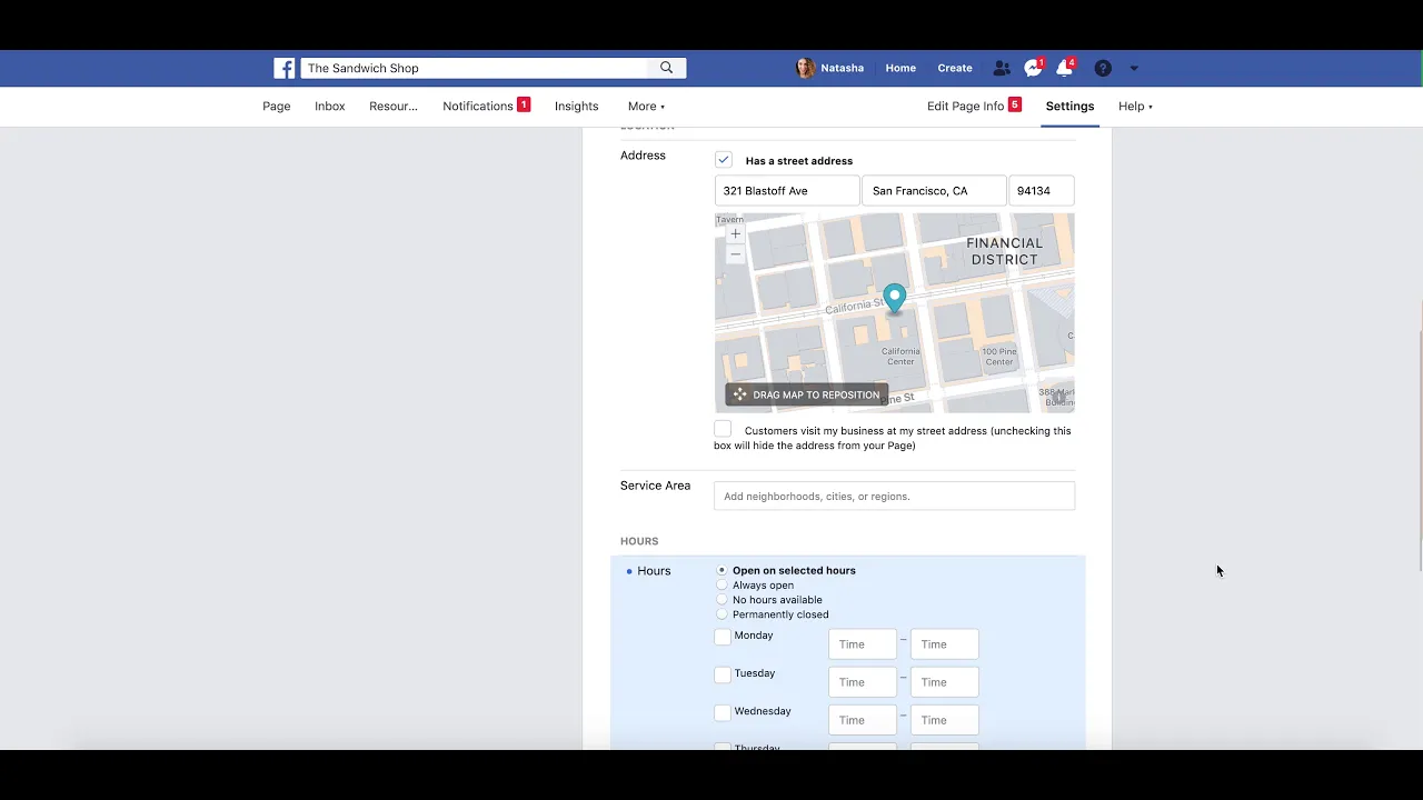photo which is your bigger photo i'm going to use a deli and then here you can create kind of your username so people can find you more easily on facebook mine's the best sandwich shop ever and it makes it so that when people go to facebook.com they can do slash the best sandwich shop ever whatever your username is so you can pop in a little bit of a description about your business the category it might fall in for searchability you can add i think a few there i'm just gonna add a couple and then any