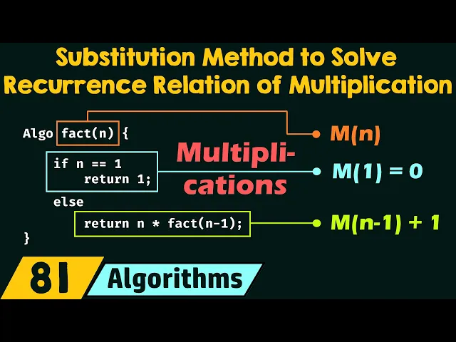 [Music] in our previous lectures we learned how to solve the recurrence relation of time and how to solve the recurence relation of return value using substitution method now in this lecture we will learn how to solve recurence relation of multiplications using substitution method so let's get started with this lecture and let's see the topics the first topic is writing the recurence relation of multiplications we will learn how to write the recurence relation of multiplications first and then we will proceed and solve the recurence relation using substitution method so first we will learn to write the
