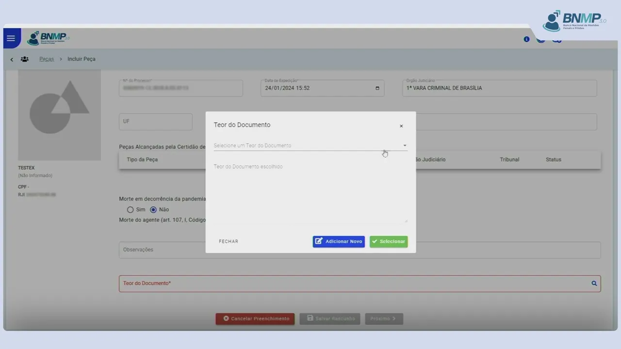 de necessidade de Lano de observações insira no campo próprio e depois clique no campo teor do documento selecione o teor que se adequa ao caso concreto e clique em selecionar clique em próximo o sistema apresentará as informações lançadas para fins de revisão Caso haja necessidade de retificação de algum dado utilize o botão anterior o usuário poderá ainda utilizar o botão salvar rascunho em caso de modificações que demandem o levantamento de dados não disponíveis no momento inexistindo a necessidade de alterações utilize o botão finalizar peça Digite o usuário senha e Clique na opção concluir peça concluída
