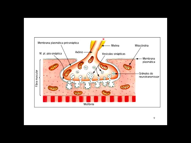 muscular toda vez que chega o impulso nervoso por esse axónio essas visível de neurotransmissor por um mecanismo cálcio dependente elas se aproximam da membrana pré-sináptica esse conteúdo interno das vesículas sinápticas que são os neurotransmissores são lançados então na Fenda sináptica E aí tem condição de chegar na membrana pós-sináptica onde encontram os receptores se for um neurotransmissor que hesite essa célula esses neurotransmissores esses receptores serão sensíveis EA a contração dessa miofibrila se esse neurotransmissor foi inibitório que vai classificar essa cenários como sendo assinado Vitória a liberação desse neurotransmissor faz com que essa miofibrila Ao invés dela