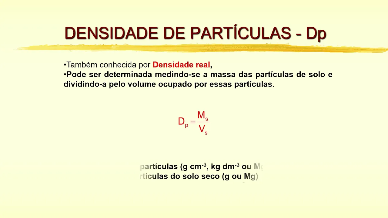 do arranjamento destas partículas ou seja não depende da estrutura do solo portanto a sua análise pode ser feita com amostras deformadas e ela pode variar em torno dos solos minerais de 2,6 2,7 gramas por centímetro cúbico solos ricos em óxidos de ferro ou metais pesados geralmente possui uma densidade partícula maior enquanto que solos orgânicos possui uma densidade partícula menor a única maneira de se alterar a densidade da partícula é por meio de manejo do solo seria aumentando a o teor de matéria orgânica deste solo dessa forma de cidade partir do seria reduzida e para a