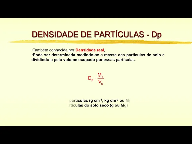 E aí Oi pessoal hoje no nosso vídeo nós iremos abordar a prática da densidade de partículas também conhecida como densidade real do solo habilidade parte Econômica mais é do que a relação entre a massa de sólidos de um solo e o volume de sólidos para geralmente vai ser Expressa em gramas por centímetro cúbico quilogramas por defender o público ou Mega gramas por metro cúbico a densidade de partículas é considerado uma propriedade bastante estável porque ela depende basicamente da composição química e da estrutura Cristalina das partículas minerais ela não depende nem do tamanho das partículas nem