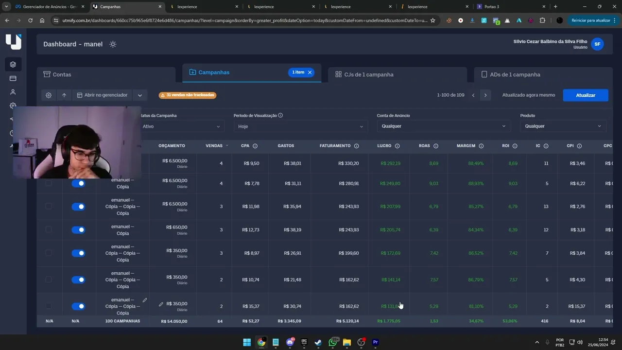 seguinte seja bem-vindo à primeira aula já vou falando não sou muito bom em gravar e aliás isso aqui não é a primeira aula né uma aula onde eu só vou mostrar onde eu escalo na prática ali no Face ads onde eu tenho meu gerenciador de anúncio aqui vou mostrar para vocês eu escalando na prática sem medo sem dó e Piedade lembrando cara são várias variações e eu vou tentar passar para vocês o que que passa durante o dia na minha cabeça para escalar tanto para escalar a ideia hoje é nós buscar pel pel menos 50k já é meio-dia era para est escalando desde as 5 horas da manhã já só que eu já acordei tarde tive que resolver os bo enfim whatever é meio-dia tipo fizemos 4K não tá tão bom de lucro temos que buscar um lucro melhor temos que melhorar o funil enfim várias coisas durante o dia que nós tem que fazer e eu vou mostrar todas essas decisões aqui que eu tomo no Face ads tá eu tô usando a Nemo a Nemo não a emif para escalar porque dentro do gerenciador de anúncio aqui eu tô com preguiça porque pela marcação de não tá tão boa então eu vou est o tempo todo aqui dentro da da do tmf que é quase a mesma coisa e quase as mesmas edições fora que tipo aqui eu terei as métricas mais precisas tá bom Aqui eu tô voltado dentro da minha campanha eu tô dentro de todas as minhas campanhas e começaram a vender tá minhas campanhas começaram a vender aqui ó te mostrar vou mostrar aqui PR vocês vendinha vendinha vendinha e pocano de venda é que é o momento que eu começo a escalar lembrando durante a madrugada o que que eu fiz temos aqui se eu não me engano sem campanhas talvez eh todas no valor de r$ 50 eu dupliquei essas campanhas era meia-noite então aqui como a minha estrutura tinha caído durante o dia tipo caiu o meu domínio E eu perdi acabei perdendo dinheiro enfim já era para est pelo menos feito R 50. 000 então eu vou ter que ir atrás do meu preju que eu tive durante o dia que não foi nada legal eu vou se sincero aqui com vocês ó eu tô com prejuízo Ó você sincero aqui com vocês eu tô um preju inho de r$ 2000 e eu vou buscar porque eu acordei tarde meu domínio tinha caído enfim caiu várias coisas minha da estrutura que acabou fazendo eu perder dinheiro a estrutura tá off então tô com menos R 2. 000 eu gastei 10.