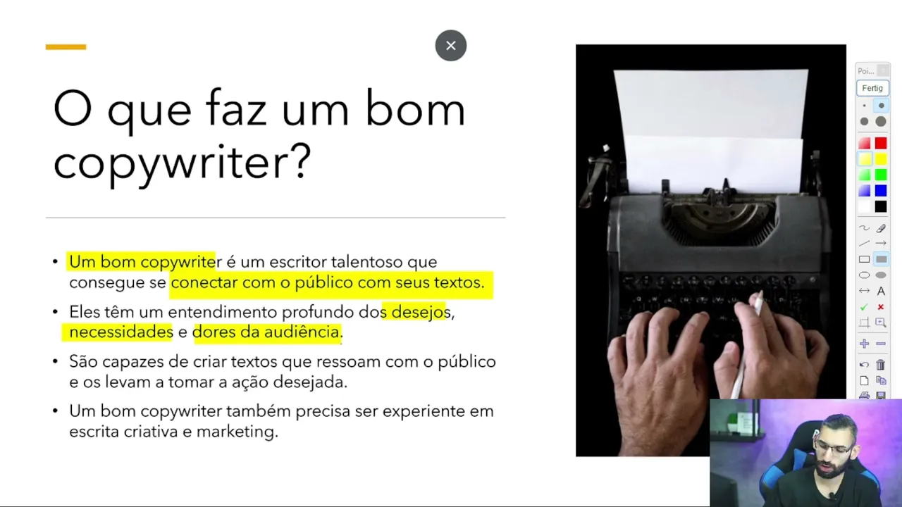 outras pessoas então às vezes a pessoa ela é muito Gênio ela é muito criativa ela tem uma ideia genial mas ela não sabe como reproduzir isso em texto por exemplo E aí ela contrata o bom copywriter ela passa ali a ideia a o modelo de negócio que ela quer ou o projeto e o copywriter vai fazer todo esse trabalho de venda eh palestras também tem copywriters ali que trabalham somente escrevendo ali fazendo roteirização do que os palestrantes vão falar isso trazendo aqui mais pro cenário de marketing digital se a gente foge disso aqui copywriter também