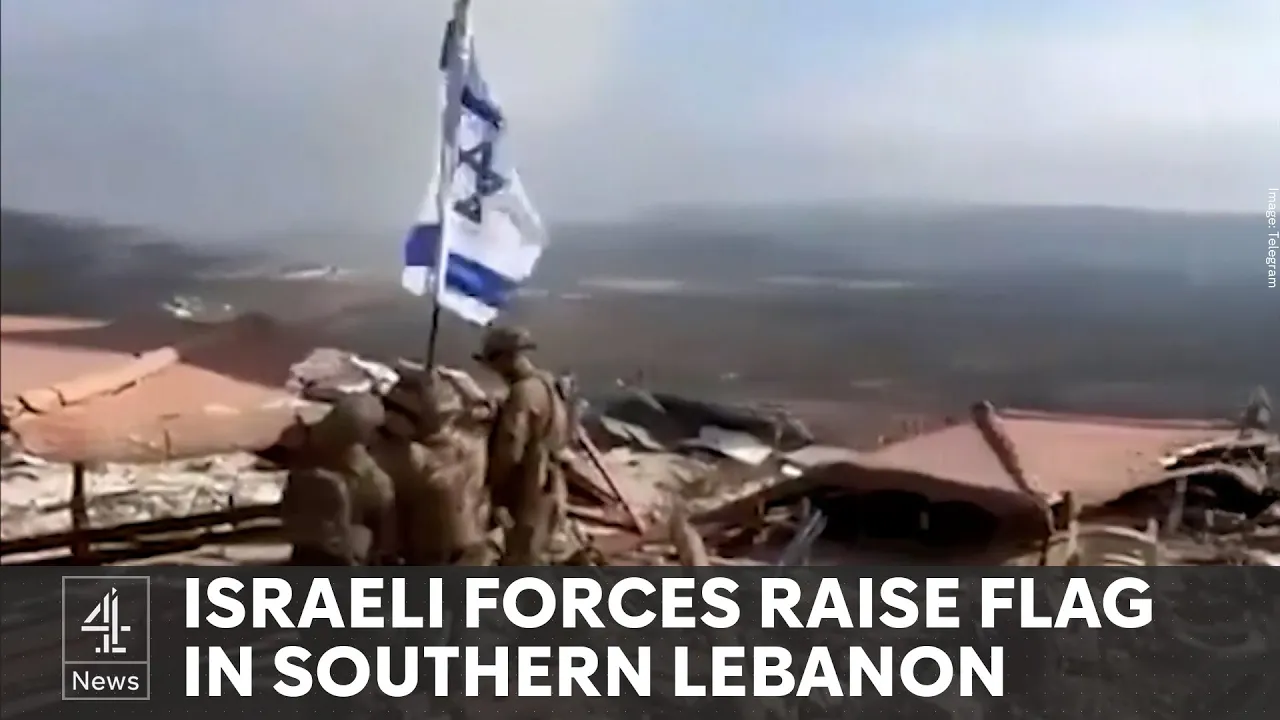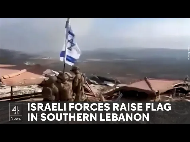 an Israeli flag hoisted above a rub strewn Lebanese Village parts of Southern Lebanon now resemble the apocalyptic landscape of Gaza and Israel's war with Hezbollah is intensifying this apparently all that's left of the Border Town of yarun the Israeli Army announced today another military division has now now been deployed into Lebanon around 15,000 soldiers are said to be taking part in The Invasion here troops show off weapons they say they've seized from Hezbollah but despite sustaining unprecedented and devastating blows Hezbollah is trying to project strength today the group's Deputy leader addressed followers in a televised