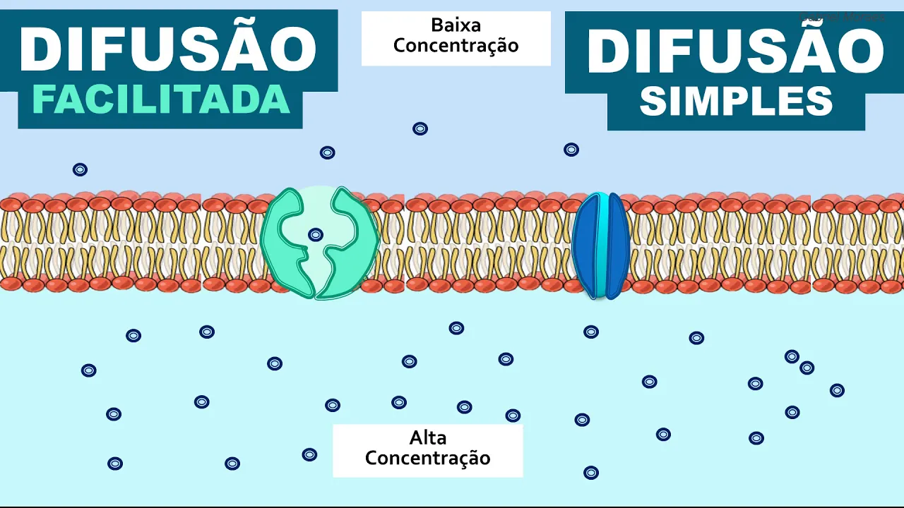molécula de um lado a outro e os dois tipos são altamente seletivos ou seja um grande controle do que deve ou não passar por essas proteínas são enfim vamos aos tipos de transporte pela membrana vamos falar nesse vídeo de transporte passivo que é mais conhecido como difusão e os seus subtipos falar de osmose e no segundo vídeo falaremos sobre transporte ativo e são submetidos iniciando então falando da difusão todas as moléculas e um corporais inclusive as moléculas de água elas estão em constante movimento esse movimento é chamado pela física de calor portanto quanto mais intensa