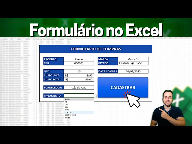 nesse vídeo Vamos aprender como fazer um formulário aqui no Excel que a partir das informações que a gente preenche e clica aqui no cadastrar essas informações automaticamente são preenchidas na nossa planilha vamos ver um exemplo prático aqui Digamos que o produto que eu queira cadastrar Ah e lembrando você pode fazer o formulário para qualquer situação diferente aqui eu tô utilizando planilha de compras mas a gente vai fazer do zero passo a passo esse formulário aqui então você coloca as informações que você quiser por quê Porque você vai ver o passo a passo do zero completo