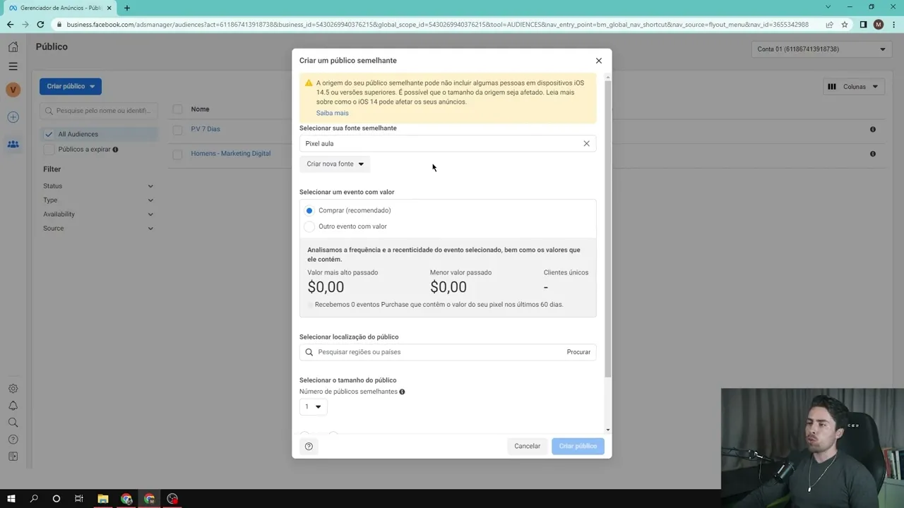 [Música] [Música] fala pessoal sejam bem-vindos a mais uma aula e nessa aula aqui prosseguindo aí da nossa sequência vou te ensinar a criar um público louca um público semelhante então a gente já criou aqui ó público salvo criamos um público personalizado e agora eu vou te ensinar aqui como é que se dá a criação de um público semelhante E como que ele funciona né então mencionei na aula anterior que um público semelhante ao público colocar lycra aquele público ali em que você conseguir criar ele com base em outro público de pessoas que já existia então vou clicar aqui ó em público semelhante E aí é o seguinte ele vai pedir pelo selecionar a fonte semelhante ou seja ele tá perguntando Beleza vou criar um público aqui mas com base em qual outro público você quer que eu crie esse público semelhante a Essas pessoas aí que você tá falando então vou selecionar aqui e você pode selecionar o seu Pixel como uma fonte ou você pode selecionar outras fontes Como por exemplo o Público aqui de pessoas que visitaram a página nos últimos sete dias eu poderia falar para o Facebook ó cria um público semelhante as pessoas que visitaram minha página nos últimos sete dias porque de certa forma São pessoas que têm interesse no produto que eu tô vendendo né já que elas visitaram a página ou então você pode clicar aqui no Pixel né selecionar o Pixel como a sua fonte e aí você deixa selecionado o evento aqui de compra e aí você cria um público muito qualificado com base naquelas pessoas que já compraram o seu produto Então as pessoas que compram o seu produto você tá vendendo ali a informação delas vai para o Pixel e fica lá com isso você consegue pedir aqui pro Facebook criar um público de pessoa semelhantes a essas pessoas que já compraram o produto que você está vendendo então para isso é muito simples eu mostrei que seleciono Pixel evento de compra coloca aqui a localização Brasil e aqui você vai selecionar o número de público semelhantes Ah é 1. 7 milhões 3. 5 milhões 5.