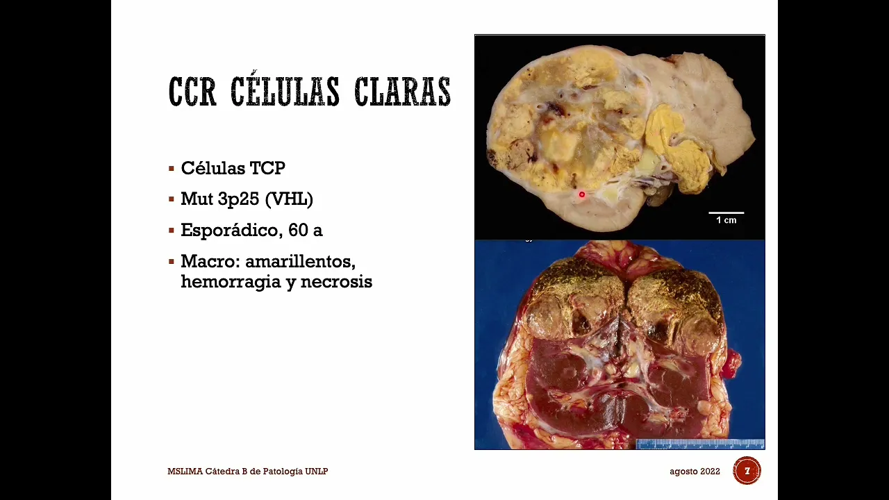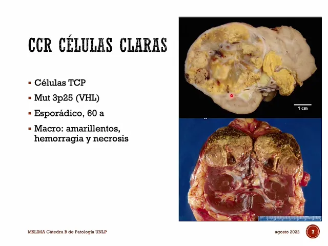 y el carcinoma de células renales con cambios sarcoma toi des como dijimos entonces es el más frecuente de todos es el carcinoma de células renales de tipos en las claras que su origen está en las salas sectoriales del túbulo contorneado proximal se asocia en su forma esporádica que es el mal más frecuente de todas a una mutación que está en el cromosoma 3 en el brazo pequeño asociándose a ese gen dhl que hoy describimos si se fijan en la imagen ahí tienen las macros copias se caracteriza por ser un tumor de gran tamaño de color