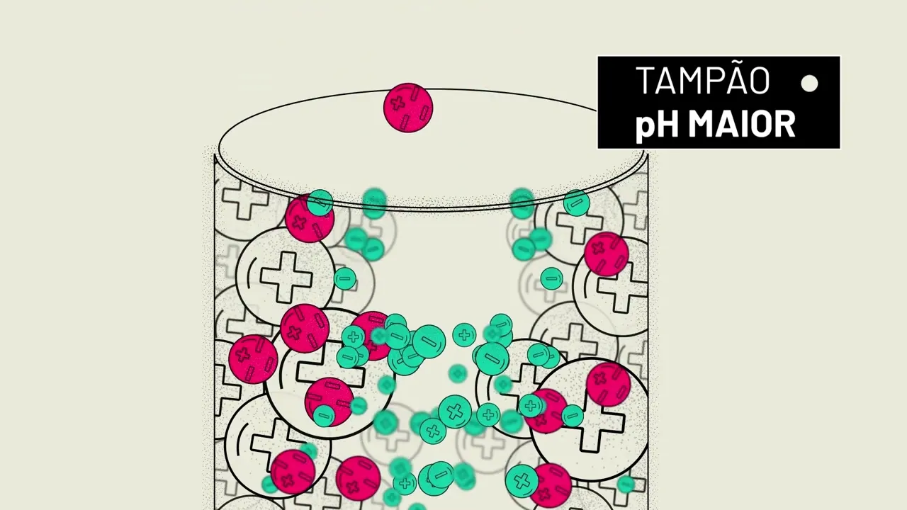 a substância de interesse essa solução tampão tem carga elétrica fraca e oposta à da resina evitando que ocorra variação expressiva no PH durante a passagem da mistura devemos lembrar que sistemas aquosos tamponados tendem a resistir a mudanças de PH quando pequenas quantidades de ácido h+ ou base Oh menos são adicionadas a escolha do tampão ideal para equilibrar a coluna é feita a partir do conhecimento do ponto isoelétrico das substâncias que se quer separar que é o ponto onde haverá neutralidade entre cargas positivas e negativas dos agrupamentos Químicos Por exemplo quando as moléculas de interesse apresentam