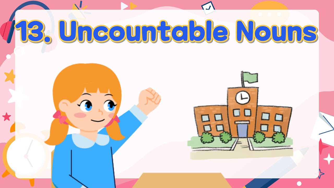 [Music] countable and uncountable nouns [Music] countable nuns we can count them one two three three apples these nouns have a singular and plural form pen s we can use a number and before none three bags a book [Music] countable nouns examples 4X three pigs two houses uncountable nouns we can't count them these nouns are always singular gem but no gems we can't use a number and before none team but not there is a tea there is one teeth there is empty uncountable nouns example juice honey bread meat [Music] uncountable nouns exception we can use a
