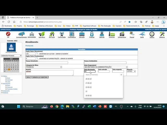 andamento daquele Ofício Então vamos dizer que seja um pedido e aqui o setor de responsabilidade quem é o setor responsável o setor responsável então é o setor de destino ele que vai tentar resolver aquilo que foi solicitado pelo remetente então setor responsável que fica então a secretaria de administração o assunto aqui referente né o que no caso da solicitando aquele documento então não tem limite de caracter então é digitado aqui a data do documento no caso vai constar a data do documento no Ofício então preenche aqui sempre com os dois últimos dias para cá se