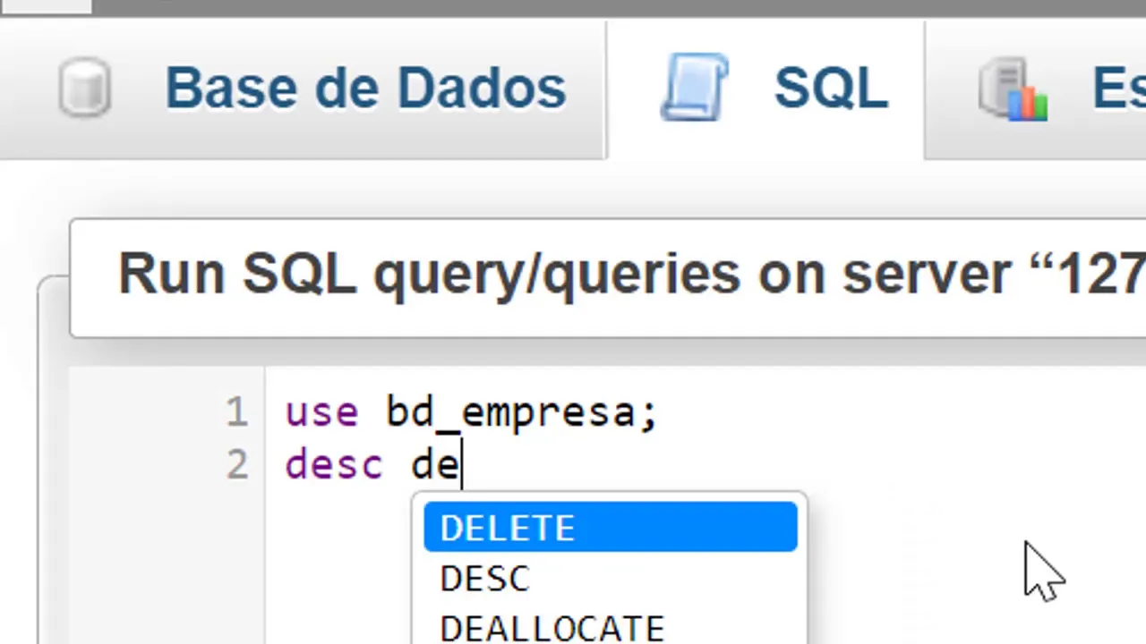 instalei e aí antes de criar a tabela a gente sabe que tem que ter um banco de dados então eu vou colocar aqui o comando criei data-base e vou colocar aqui beber underline empresa ó e vou executar Ok Criei um banco de dados mas o meu banco de dados está vasinho Então antes de eu criar a tabela uma dica muito importante esses tem que selecionar o banco de dados então eu uso bebê a empresa e estando aí com esse comando eu vou colocar agora o comando Create table pessoal então vou colocar aqui para nós vai