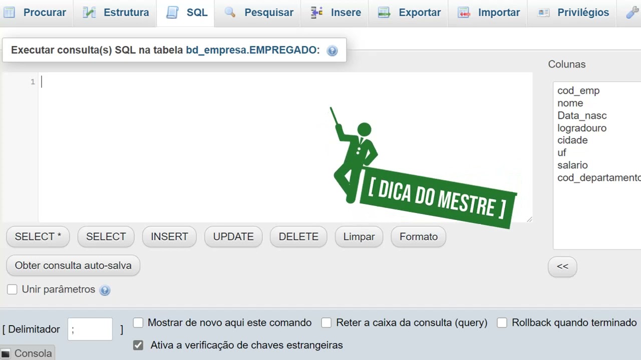 estrutura a visualizar a tabela a gente vai aprender a pagar uma tabela do banco de dados Então a gente vai usar o comando drop table e vai colocar o nome da tabela como eu acabei de renomear e a tabela empregado para funcionário eu vou colocar aqui ó drop table funcionários atenção quando você faz isso a tabela é apagada do banco de dados e consequentemente Se tiverem dados dentro dessa tabela a gente vai perder todos esses dados então a gente só deve utilizar o comando drop table se a gente tiver absoluta certeza do que a gente