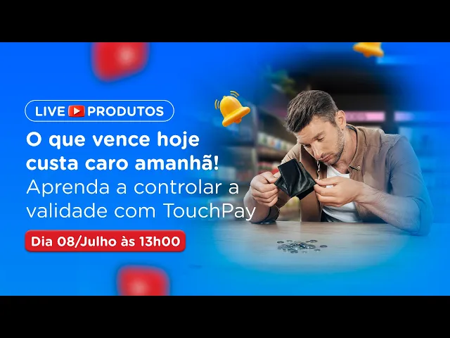 ser o tema da live, qual vai ser o horário e vamos tá junto, né, aprendendo a usar o Touchpay aí da melhor forma possível, porque como vocês viram aqui, ele é sim muito completo. Ele tem aí eh pensando, por exemplo, na questão do controle de validade, tá? Tem como você ver o que tá vencendo, tem como você criar uma promoção pro que tá vencendo para não deixar vencer. Tem como você ver o que já venceu. Tem como você ir no mercado ali com o celular, que nem eu fiz aqui, você rapidamente abre ali, já muda