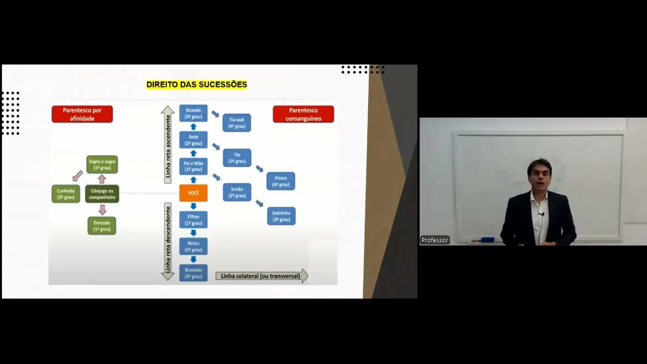 000 para o bilateral R 75. 000 para o unilateral e os outros 75. 000 para o outro unilateral por quê Porque nos termos do 1840 que nós acabamos de ver na classe dos colaterais os mais próximos excluem os mais remotos Ok do 1841 Desculpa pessoal concorrendo a herança do irmãos bilaterais com irmãos unilaterais cada um destes herdará metade do que cada um daqueles herdar então cada um destes unilaterais herdará metade do que aqueles são os bilaterais herdarem eu tenho essa regrinha portanto pessoal para privilegiar que aquele meu irmão que é irmão de pai e de mãe receba o dobro do que aquele irmão que é somente de pai ou de mãe receberá então 1841 diz exatamente isso aqui Portanto o filho do o filho TR e o filho 4 falecendo o filho um não deixando mais nada que vai acontecer o 2 recebe 150 o 3 recebe 75 e o 4 recebe 75 de um total de 300 volto a frisar pessoal se fossem todos irmãos bilaterais cada um receberia 100 a gente dividiria por igual por quê Porque daí a regra ela é mais simples Deu para entender pessoal qualquer dúvida dúv por favor manda e-mail lá para mim para que a gente possa especificar um pouco mais usar outros exemplos e assim por diante artigo 1842 não concorrendo a herança irmão bilateral herdarão em partes iguais os unilaterais Então vamos supor que aqui ó o filho um que é bilateral não mais existia que que iria acontecer o filho três e o filho 4ro sendo os únicos irmãos eles receberiam em partes iguais Ok e pessoal só tomar um cuidado tá eu tô falando aqui de filho só para ficar mais fácil porque essa foi a denominação mas aqui nós estamos falando de herança vinda de irmão o filho um que é o irmão do dois do três e do quatro ele que morreu e deixou a herança a ser partilhada primeiro pelo dois pelo três e pelo quatro e depois somente pelo três e pelo quatro Esse é o exemplo Ok independentemente do que nós falamos do falecimento do João o João aqui foi só pra gente especificar de onde vieram os irmãos então espero que tenha ficado Claro por favor qualquer coisa vocês me avisem aí Outro ponto importante caso não haja mais irmãos do Falecido como resolver embora sobrinhos e tios sejam parentes colaterais de terceiro grau a lei da preferência sempre aos sobrinhos como nós mencionamos aqui no outro exemplo o sobrinho entra em disputa com o tio mas prevalece daí a a a a ele essa herança na falta de irmãos herdarão os filhos destes e não os US vendos os tios aí tudo bem eu eu tenho então duas classes de terceiro grau mas que o sobrinho prevalece em relação ao tio o sobrinho não existindo aí vai tudo pro tio Ok Como dito no caso de falecimento do irmão e não havendo sobrinho a herança é destinada aos tios Regra geral entre os sobrinhos E aí como que eu resolvo entre os sobrinhos pessoal aqui nós vamos ter da mesma forma que nós falamos em relação aos irmãos eu tenho bilateral e unilateral vamos supor que aqui ó havendo aqui né a divisão filho do TRS e 4 o filho dois não mais exista quem é que vai herdar o filho dele que é o sobrinho Ok e o sobrinho receberá os mesmos 150.